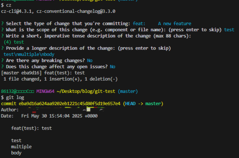 上文提到,我们可以通过Vim编辑器进行自己编写,但手写的情况下过于麻烦,也容易写错单词,这时我们就可以使用Commitizen工具快速的生成一个标准提交信息进行提交。
