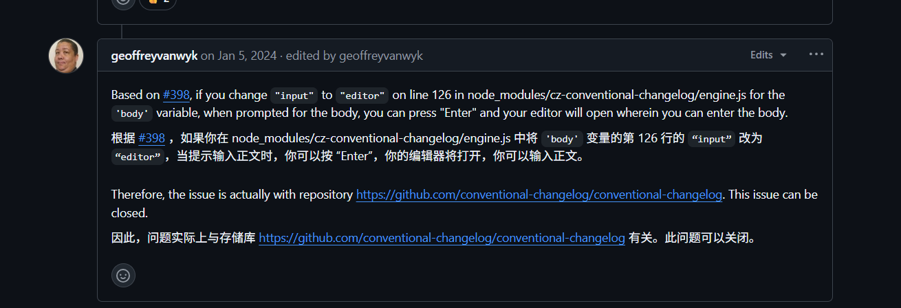 [npx] cz/git-cz -e命令,加入-e配置后,会在生成符合约定格式的信息后,再打开编辑器让我们编辑,这个时候我们就可以对body进行多行设置了。 -